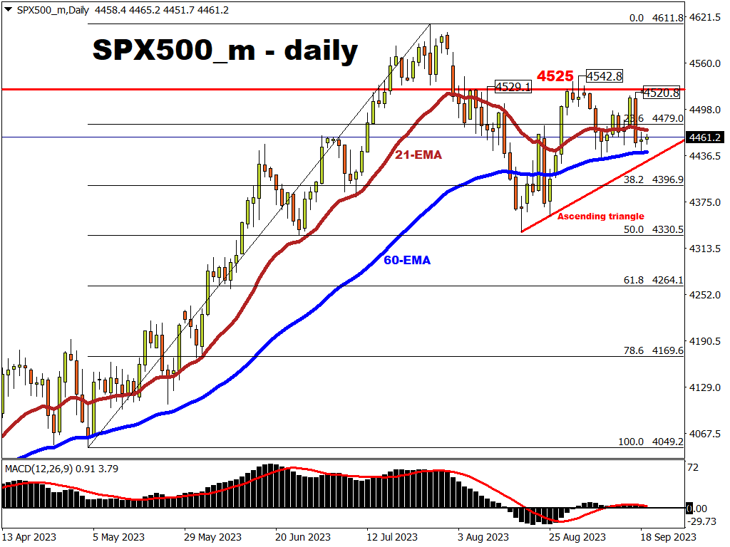 Ahead of major central bank meetings in the coming days, the benchmark US stock index is coiling into an ascending triangle.
