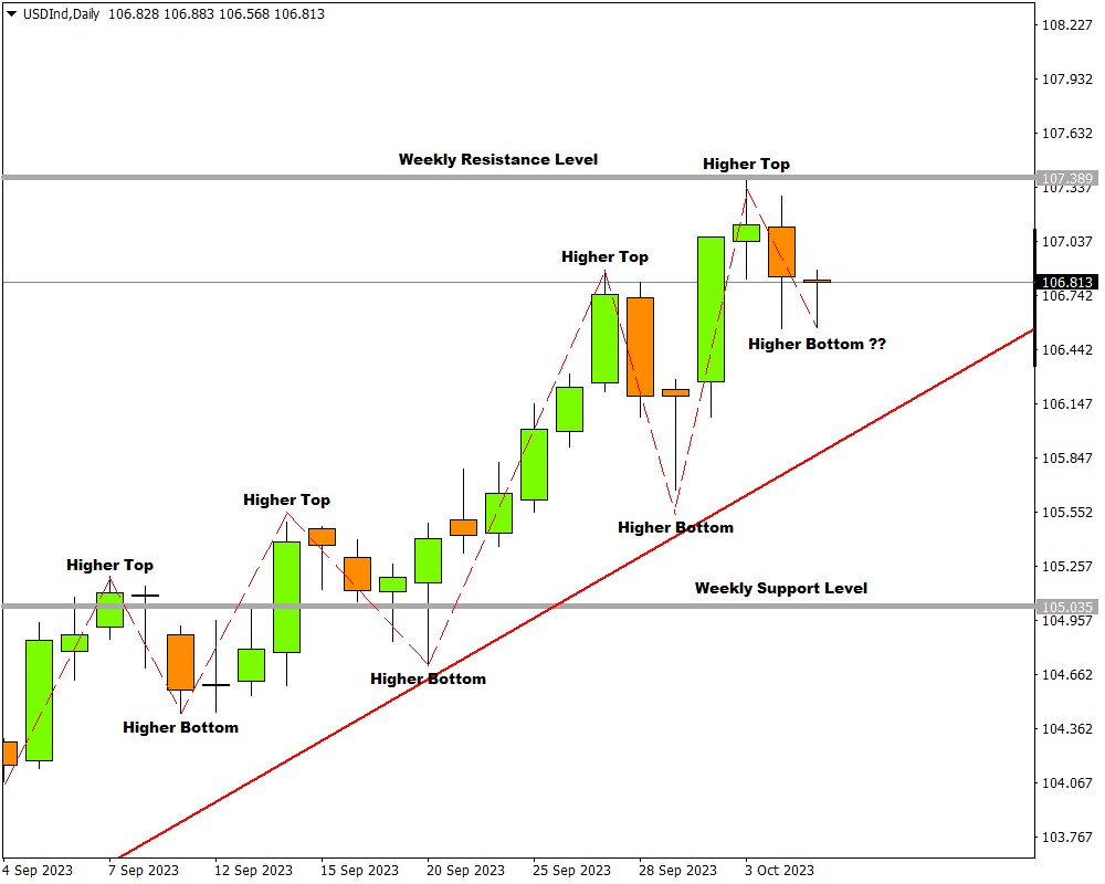 The underlying US dollar index has climbed by 3.2% so far in 2023, with this textbook uptrend evident since mid-July as it posted consecutive higher tops and higher bottoms.