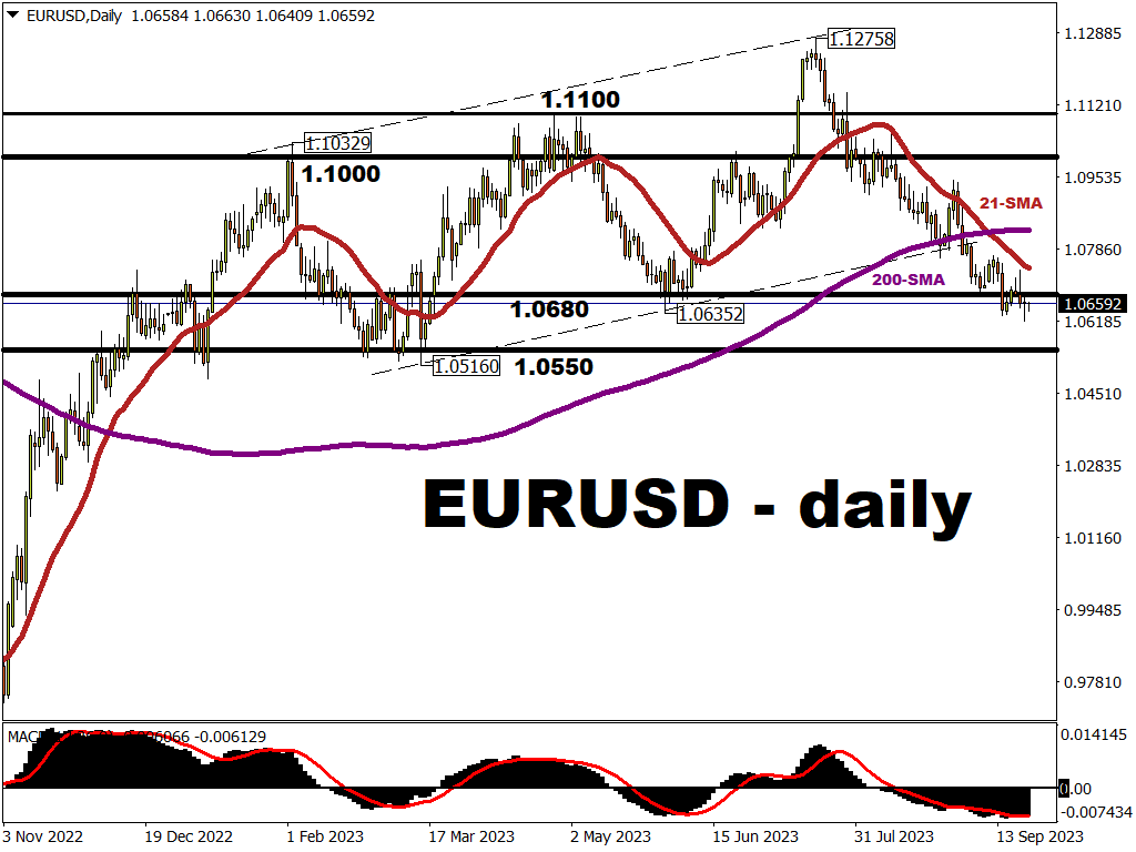- EURUSD may be dragged to a fresh 6-month low if the coming week’s data out of Germany/Eurozone further sours the bloc’s economic outlook and narrows the ECB’s chances at one last rate hike in this cycle, while the US PCE Deflators and Fed speak strengthen the case for one final Fed rate hike in this cycle.