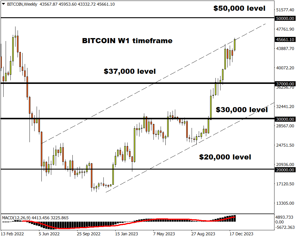 - The next key level of interest is at $50000. Beyond this point is the all-time high just below $69,000 with a breakout above this level perhaps opening a path towards $100,000.