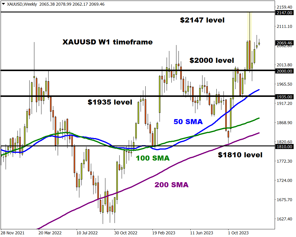 - Should $2000 prove to be reliable support, this may re-open the doors towards the all-time high at $2147 and beyond.