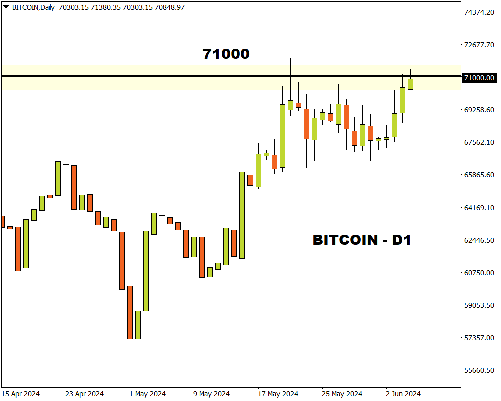 Bitcoin is trading roughly 4% away from its all-time high at $73850.
