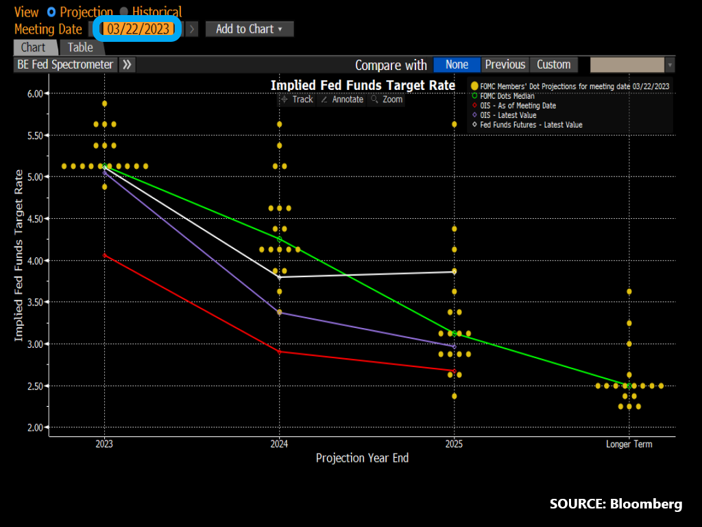 For reference, here’s the Fed’s previous “dot plot” from March 2023, featuring FOMC members’ forecasts for US interest rates: