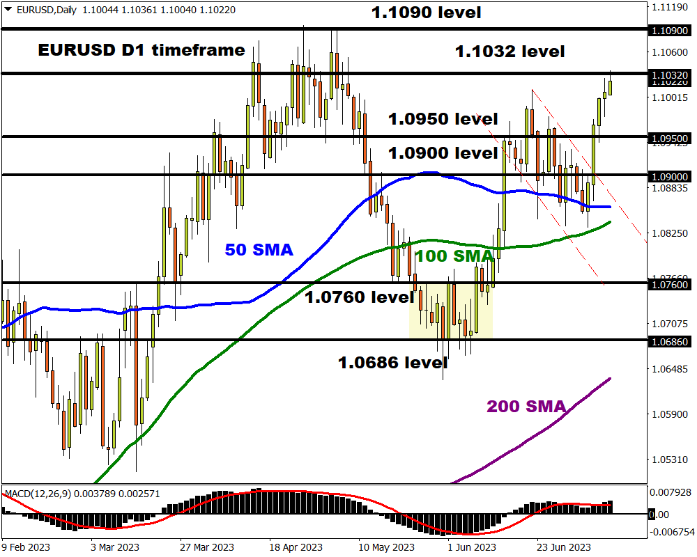 A weaker dollar has propelled the EURUSD to levels not seen since early May around 1.1032. Prices are firmly bullish on the daily charts with a breakout above 1.1032 opening a path towards 1.1090. Should bulls run out of steam, a decline back towards 10950 and 1.0900 may be on the table.