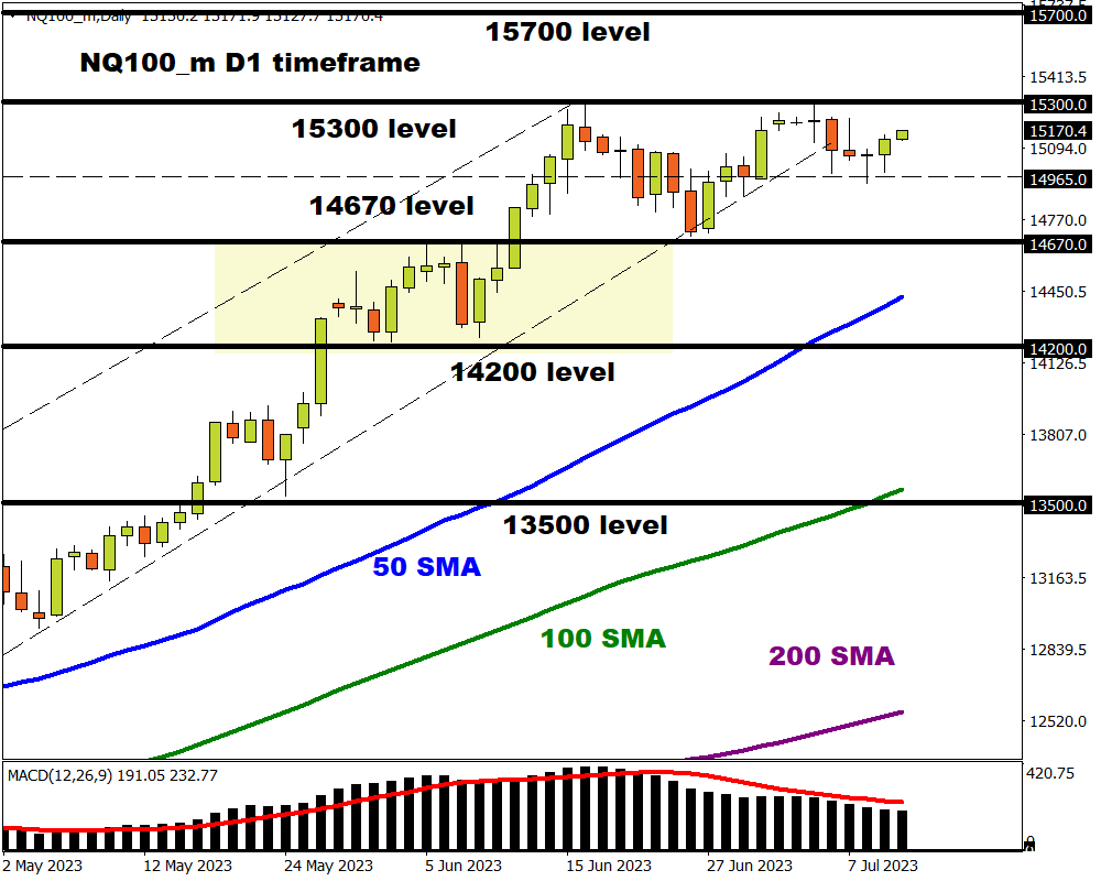 The NQ100_m could be gearing for a breakout on the daily charts if prices push beyond 15300. A solid close above this point may encourage an incline towards 15700. Any signs of weakness in the uptrend could see prices retest 14965 and 14670, respectively.