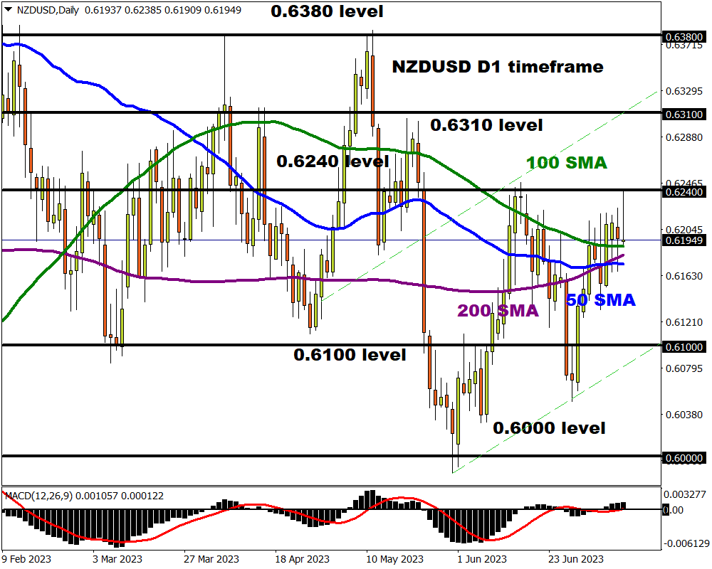 It was a choppy affair for the NZDUSD after New Zealand’s central bank left interest rates unchanged for the first time in almost two years. The currency pair spiked towards 0.6240 before giving back gains. Prices remain trapped within a range with support around 0.6100 and resistance at 0.6240. A breakout above 0.6240 may see an incline towards 0.6310. Should prices slip back under 0.6100, we could see 0.6000.