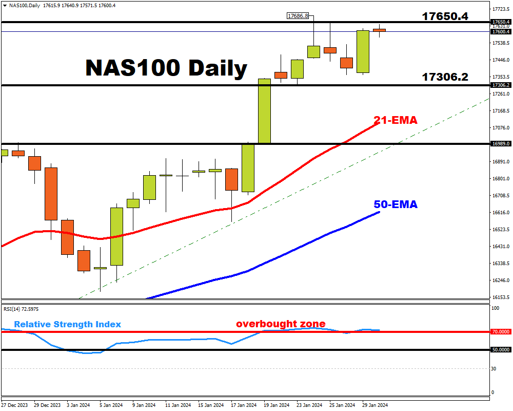The Relative strength index (an indicator that highlights overbought and oversold zones) reveals that NAS100 is overbought.