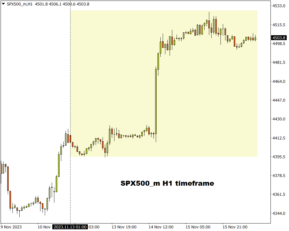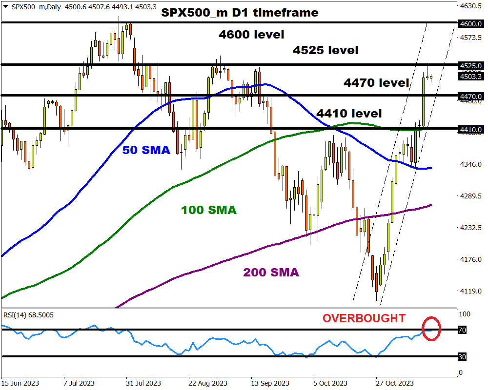 Looking at the daily timeframe, bulls have been on a roll over the past few days with the SPX500_m rallying over 7% since the start of November. However, bulls are currently eyeing a significant resistance level at 4525.