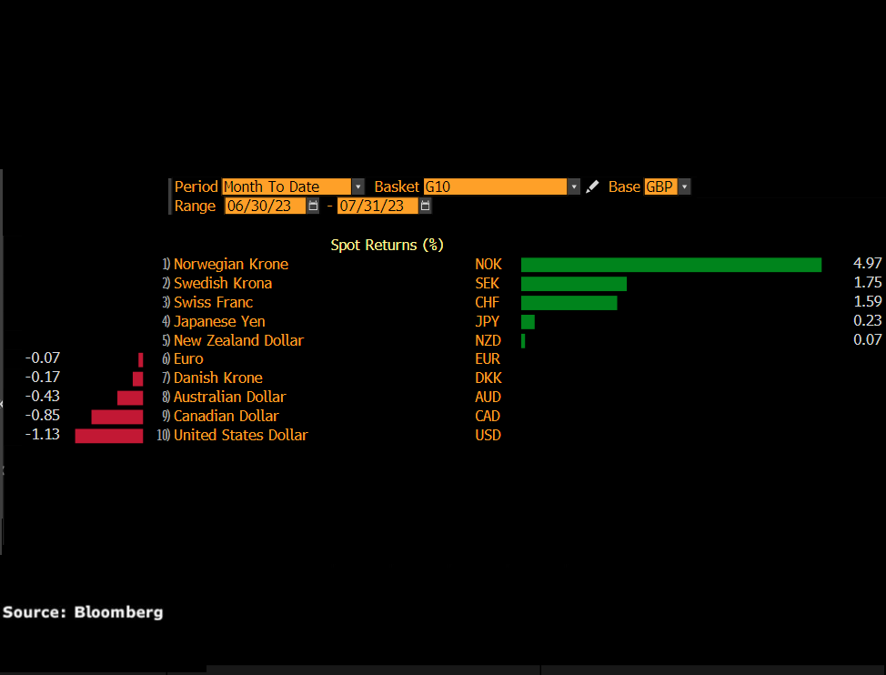 Markets widely expected the BoE to raise interest rates by 25 basis points. This would be the fourteenth straight rate hike, taking the key rate to 5.25% - its highest level since 2008. Despite UK consumer price inflation dropping to 7.9% in June, it remains well above the BoE’s target. This is likely to fuel expectations around more rate hikes despite disappointing economic data fuelling recession fears.