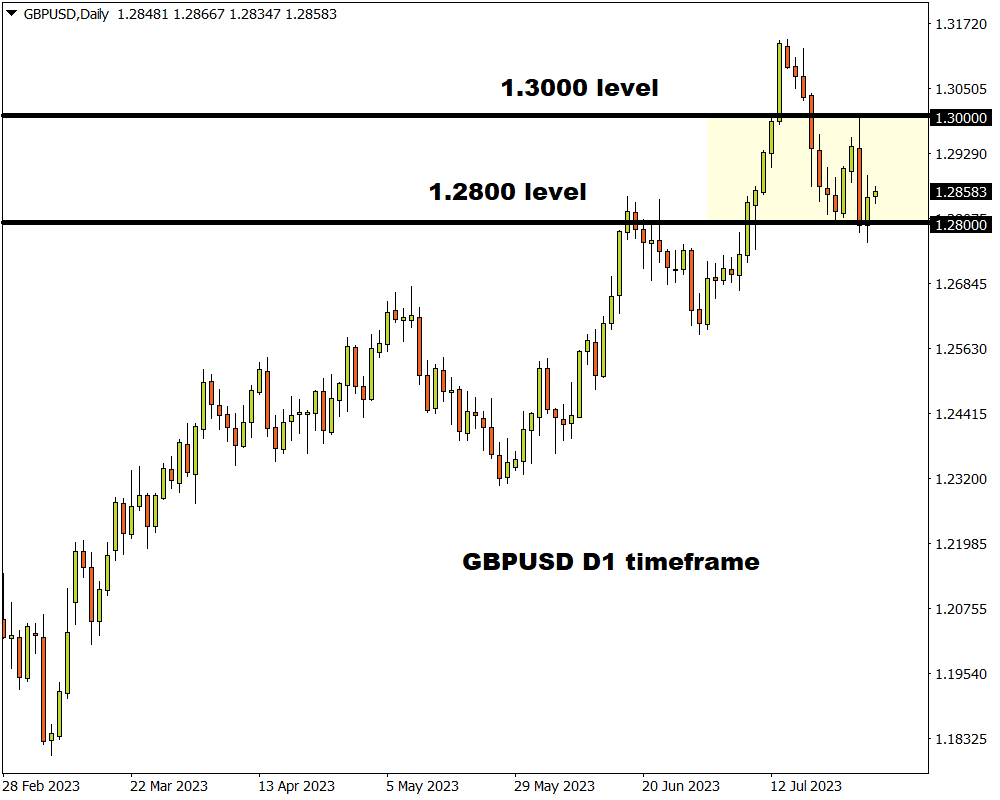 Over the past few weeks, buying sentiment toward the currency has been influenced by conflicting forces – placing bulls and bears in a fierce tug of war. Pound bulls continue to draw strength from rising expectations over the BoE keeping rates higher for longer in the face of sticky inflation. But bears remain supported by growing recession fears as UK economic data disappoints. Regarding the technical picture, the GBPUSD has found itself back within a wide range with support at 1.2800 and resistance at 1.3000.
