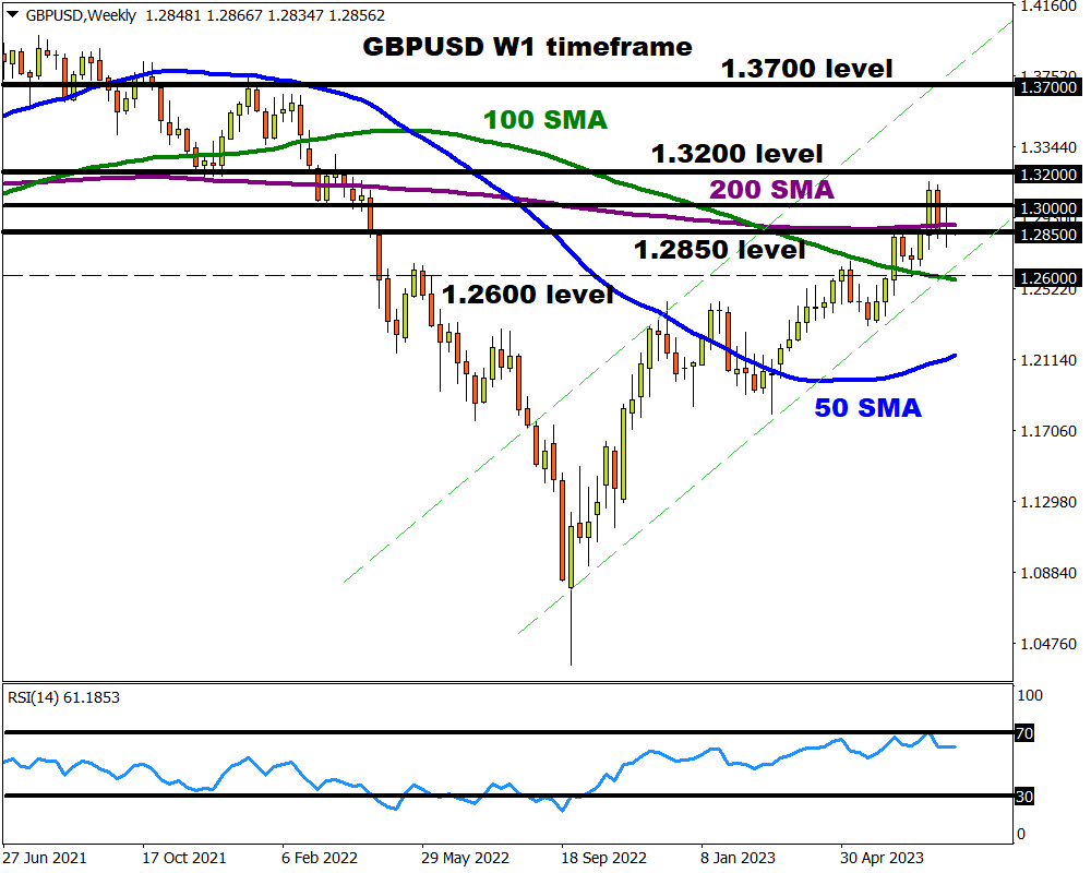 The GBPUSD remains in a bullish channel on the weekly timeframe. However, prices are trading around a significant pivotal point at 1.2850 just below the 200-week SMA. If bulls can keep above this level, and leverage this support to push beyond 1.3000, the next key resistance can be found around 1.3200. However, a breakdown below 1.2850 may see a decline towards the 100-week SMA at 1.2600.