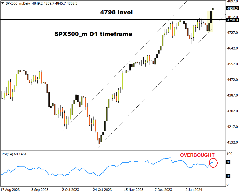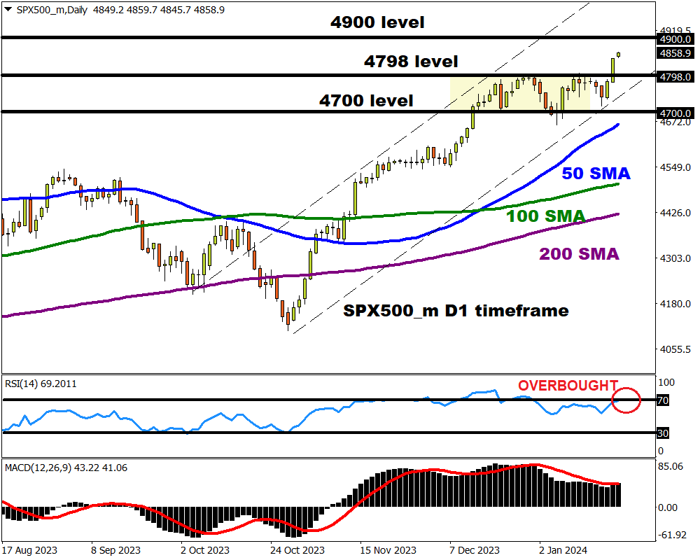 The index has not only topped the previous record set in January 2022 but also confirmed that it has been in a bull market since the October 2022 low. When considering the shaky start to the new year, it looks like SPX500_m bulls have regained their mojo.