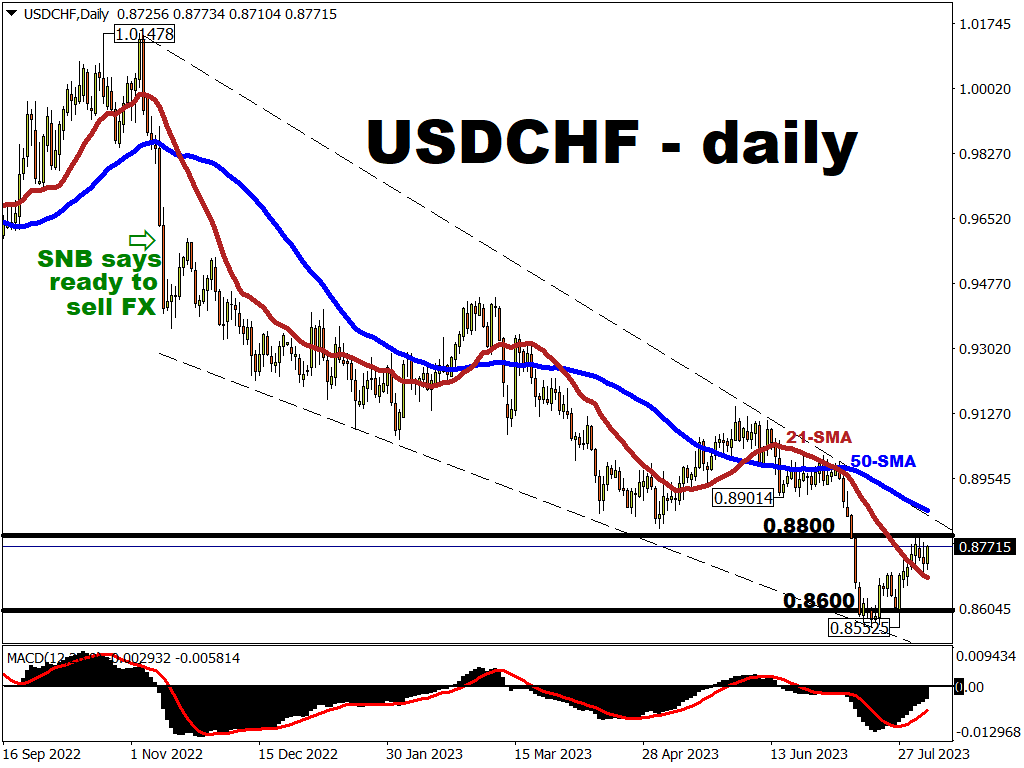 Back in mid-July 2023, USDCHF dipped below 0.8600 for the first time since 2015 - when the SNB lifted the Swiss Franc’s cap against the euro, which resulted in a skyrocketing CHF (and a plummeting USDCHF).