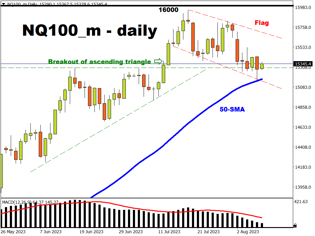 Interestingly, yesterday’s price action also saw the 50-day SMA on the daily chart act as a dynamic support with a rejection of price at the 15151.3 low to close within the flag pattern.