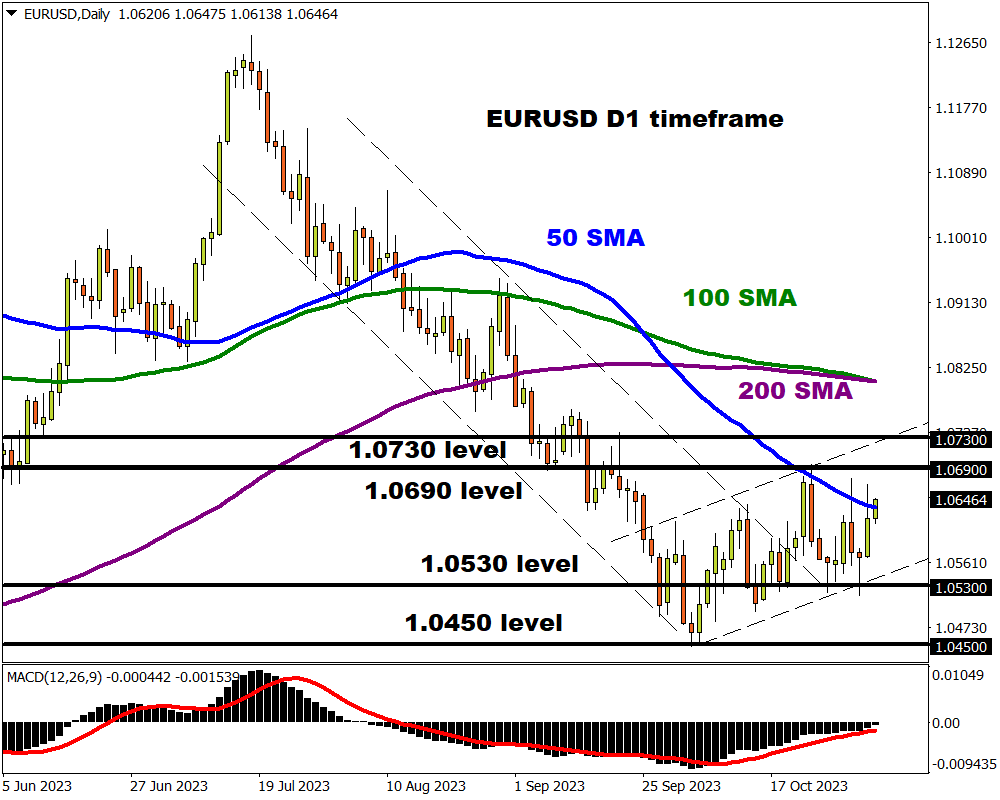 - If Powell along with Fed officials sounds more hawkish and US data beats forecasts, expectations could rise around one more Fed hike before the end of 2023, pulling the EURUSD lower as the dollar strengthens.