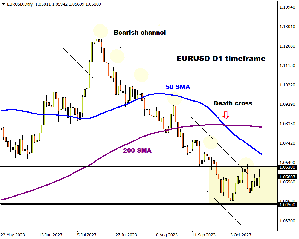 Before we identify what factors could spark a major move on the EURUSD, it is worth pointing out that the currency pair has been trapped remain a range since late September. Nevertheless, the path of least resistance points south with technical indicators in favour of bears.