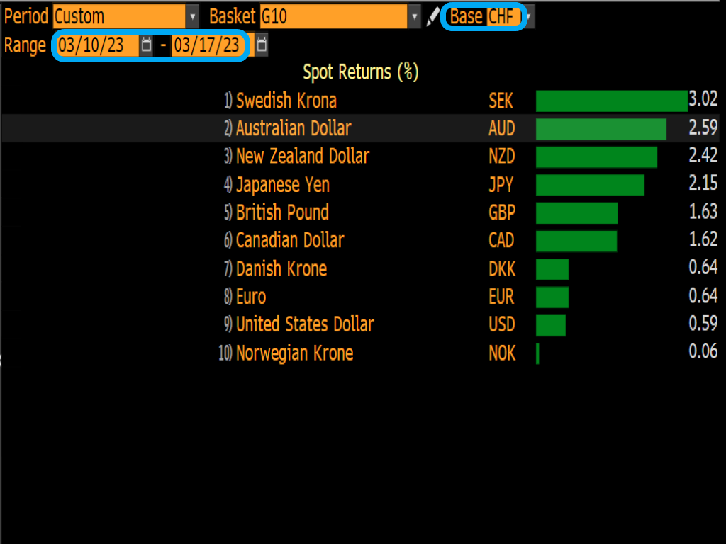 Note how CHF weakened against every single one of its G10 peers as the CS drama played out across global financial markets this week: