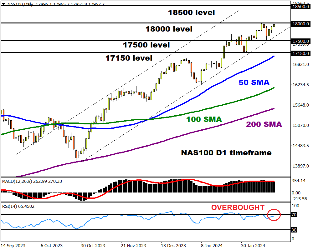 The NAS100 is firmly bullish on the daily timeframe with prices trading firmly above the 50, 100, and 200-day SMA. However, the Relative Strength Index (RSI) signals that prices are flirting around heavily overbought levels.