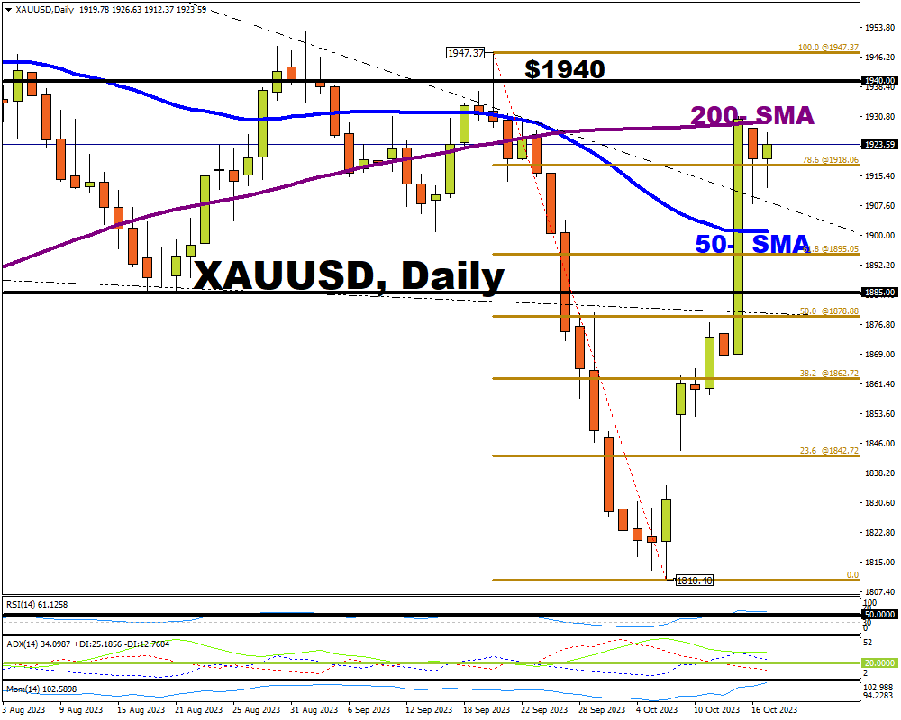• and the 78.6 Fibonacci level at $1918.06, when drawn from September 20th’s high of $1947.37 to October 6th’s low at $1810.40, is currently acting as support.