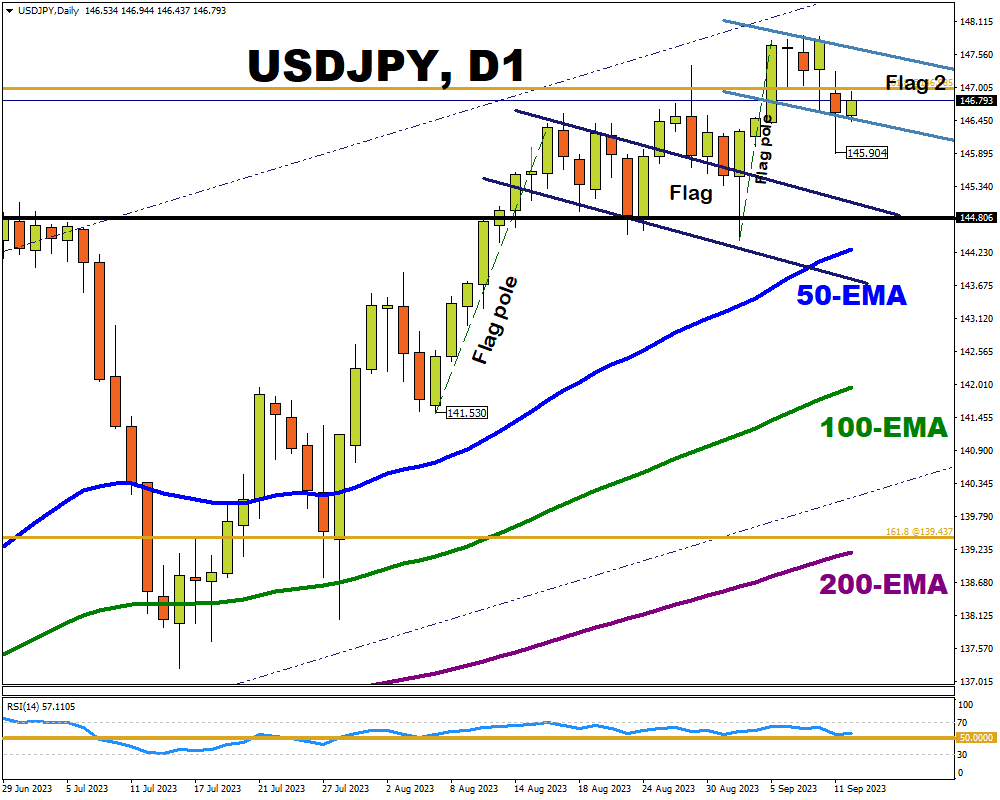 - USDJPY busy forming second flag since August, amidst year-to-date uptrend